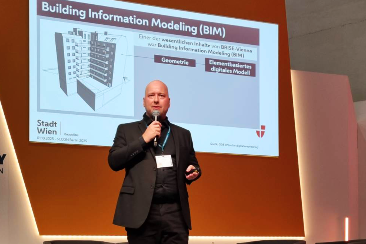 Im Mittelpunkt des diesjährigen Auftritts der Stadt Wien stand das openBIM-Bauverfahren der Wiener Baupolizei (MA 37). Diese neue digitale Prüfsoftware baut auf den Erkenntnissen aus dem Forschungs- und Entwicklungsprojekt BRISE-Vienna auf und kann die Bauanträge künftig teilautomatisiert prüfen und Genehmigungsprozesse dadurch deutlich beschleunigen.
